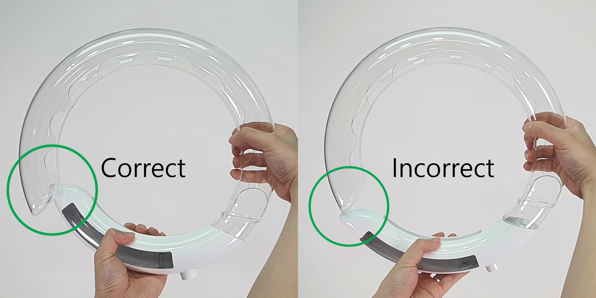 1. Make sure the clear window on the pot faces forward and the power switch on the base is also facing forward before connecting them. If connected backward, the plant light will not work.